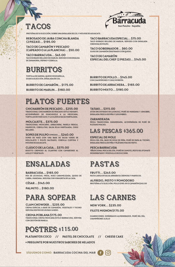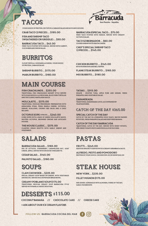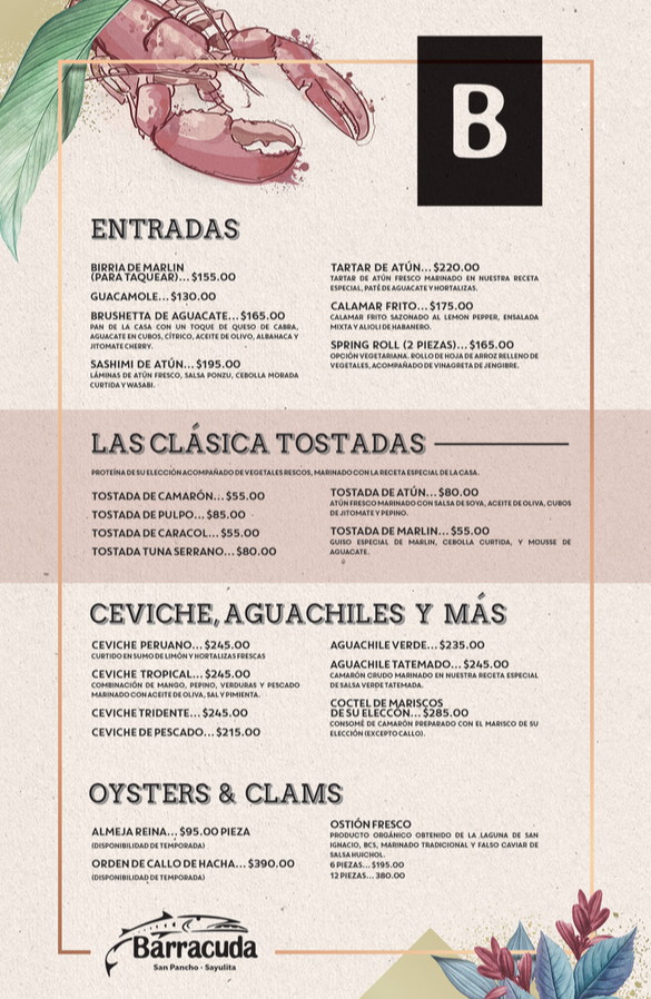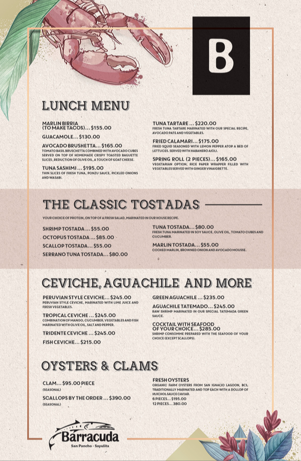 Welcome to Barracuda Sayulita, a culinary gem nestled just steps from the beach in the vibrant town of Sayulita, Mexico. Our menu embodies the spirit of coastal cuisine, featuring fresh and flavorful seafood that captures the essence of the ocean.